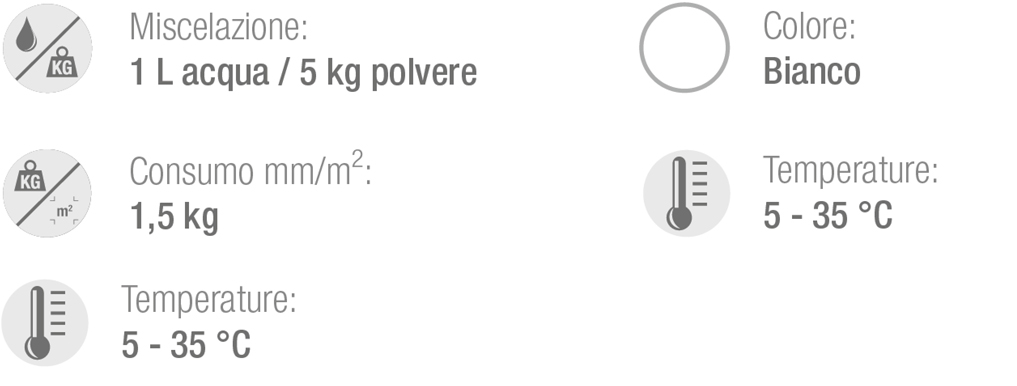 - Uso immediato e largo tempo di lavorabilità (2 ore).